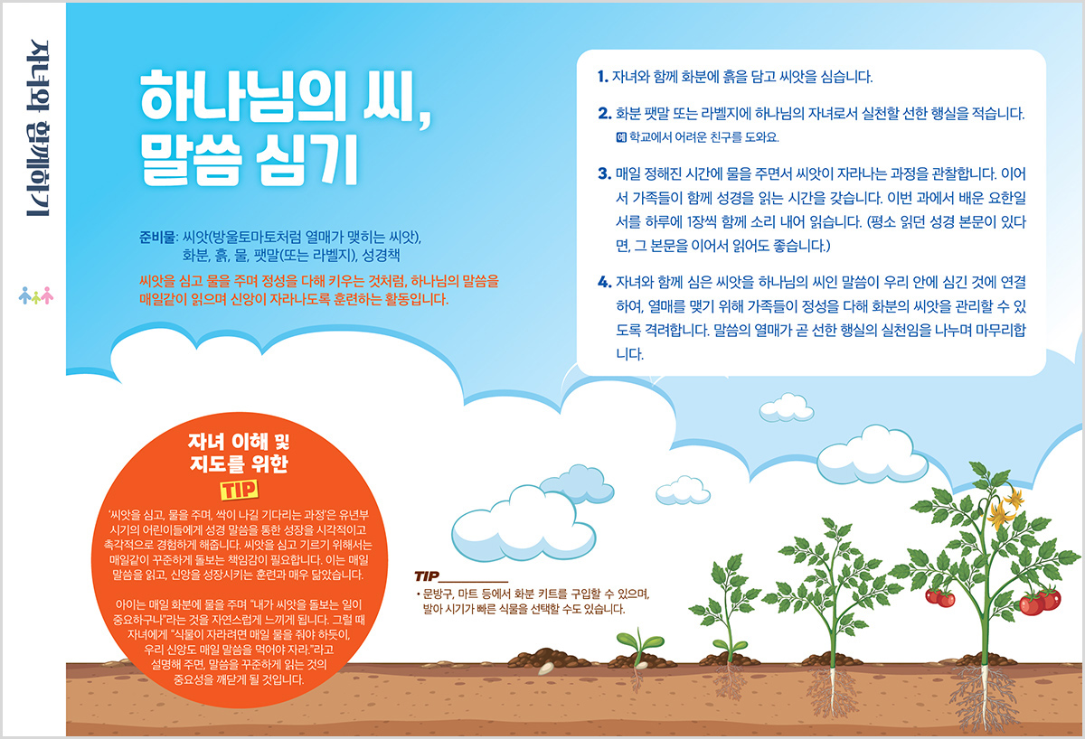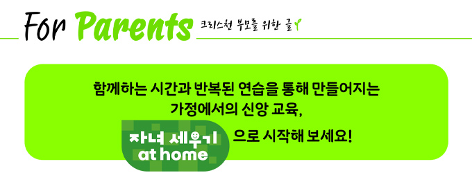 으로 자녀와 함께 고민하고 실천하며 애쓰는 시간을 통해 우리의 가정은 진리가 스며들어 생명이 숨 쉬는 거룩한 장소가 될 것입니다.