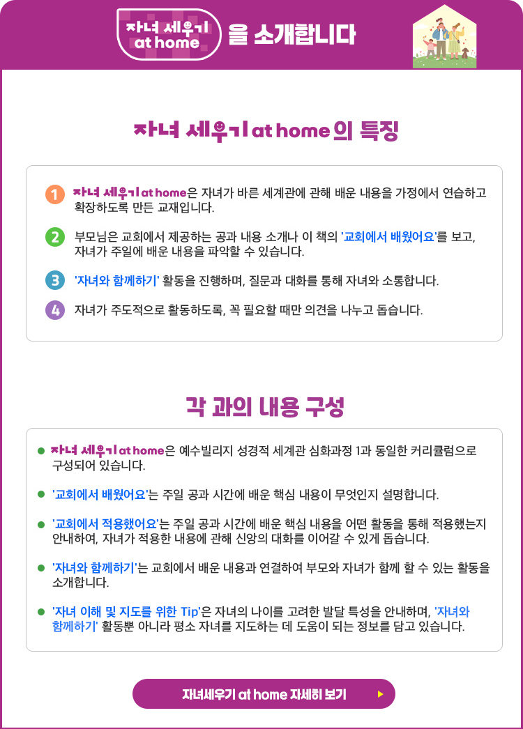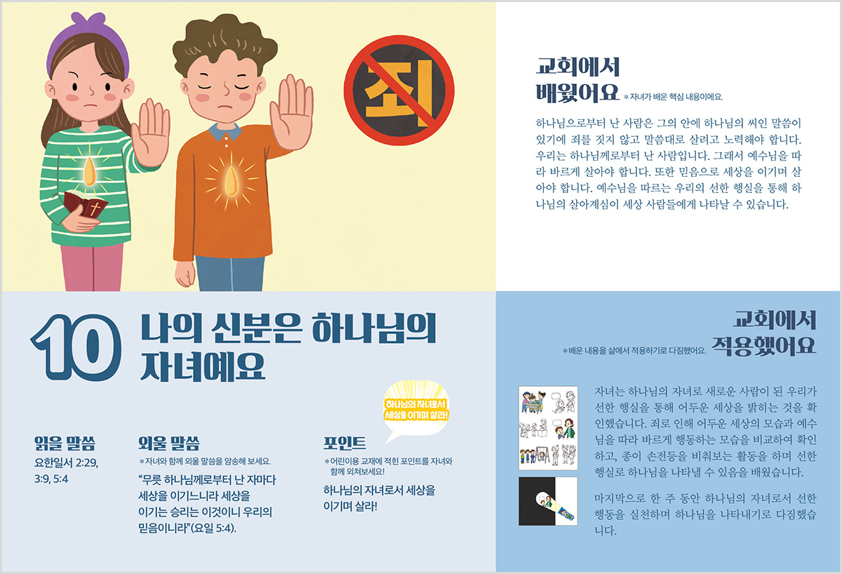 ‘자녀와 함께하기’는 배운 진리를 적용하기 위한 반복적인 연습을 이끄는 활동입니다. 말씀을 점검하고 삶의 적용을 다짐하는 다양한 활동 과정에서 가족이 함께하는 의미 있는 시간을 만들어낼 수 있습니다.