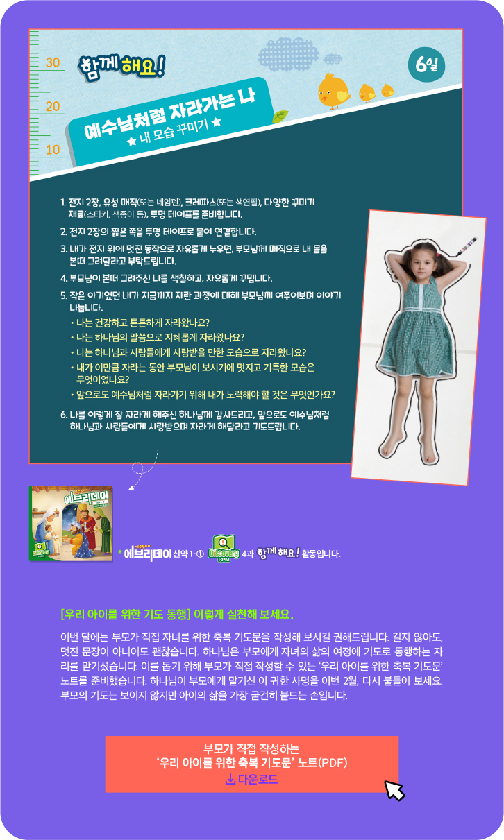 자녀가 스스로 자라가도록 부모가 기도로 동행하겠다는 이 고백을 기억하며, 가정에서 자녀와 함께 ‘예수님처럼 자라가는 나’ 활동을 해보시길 제안합니다. 현재 자녀의 모습을 그림으로 그리고, 예수님의 자람을 따라 얼마나 성장했는지 함께 나누는 시간을 갖는 것입니다.